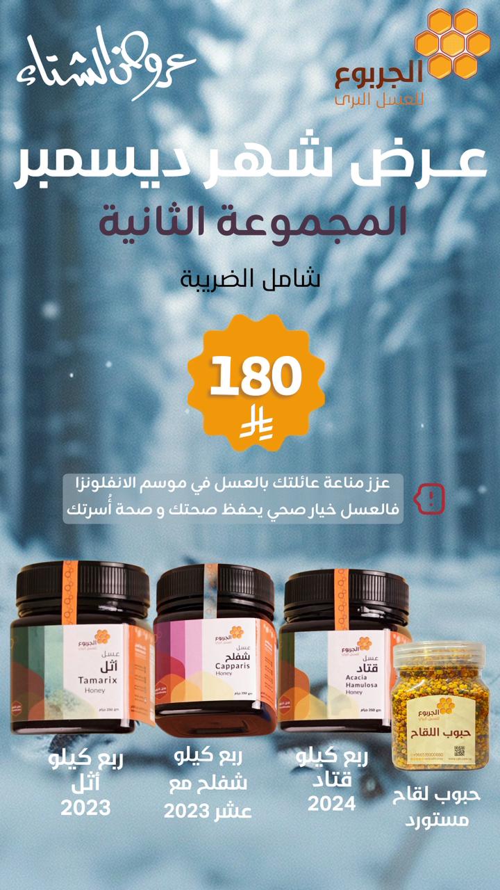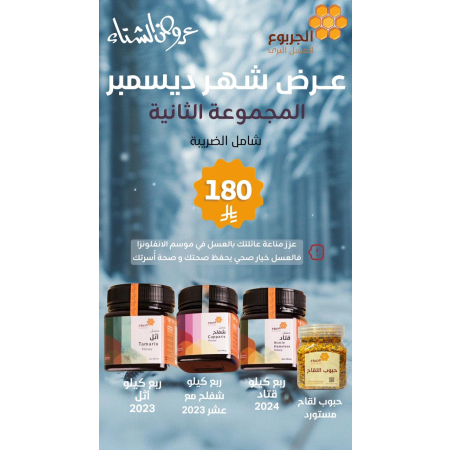عسل قتاد -250جرام- (انتاج 2024) + عسل شفلح مع عشر -250جرام- (انتاج 2023) + عسل أثل -250جرام- (انتاج 2023) + حبوب لقاح مستورد (110 جرام)